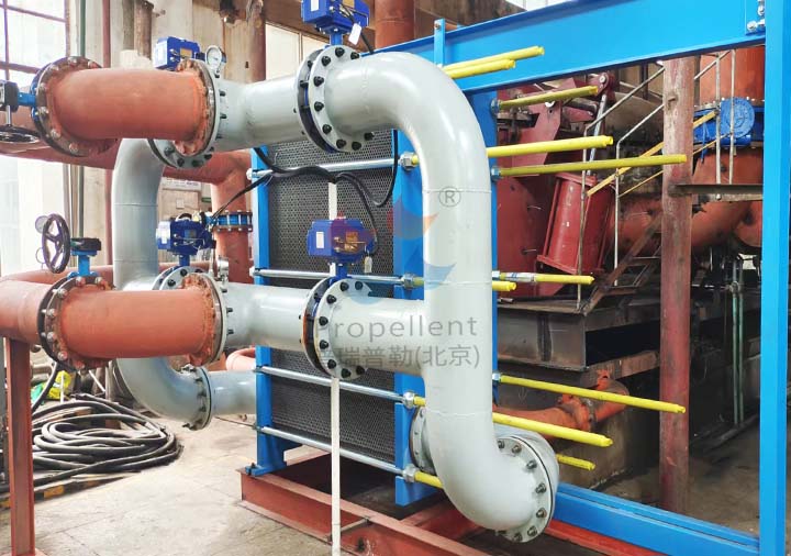 糖廠廢蜜粘度較高,流動性差,因此廢蜜冷卻器采用普瑞普勒(北京)公司可拆式寬流道板式換熱器,以更好的通過性、傳熱性能、承壓性能,保證廢蜜的流動性和通過性,用冷卻水將廢糖蜜進行冷卻,從而降低廢蜜的溫度,以便更好的存儲及應(yīng)用。普瑞普勒(北京)公司寬流道板式換熱器作為廢蜜(桔水)冷卻器在甘蔗制糖行業(yè)得到了廣泛認(rèn)可。