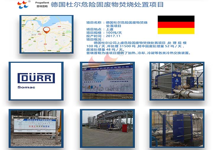 德國杜爾公司上虞危險固廢物焚燒處置項目,處理規(guī)模100噸/天,年處理量31500噸,其中固廢處理量52噸/天,廢液處理量48噸/天。 北京普瑞普勒為該項目提供了加熱、冷卻、冷凝等各類冷熱交換裝置。